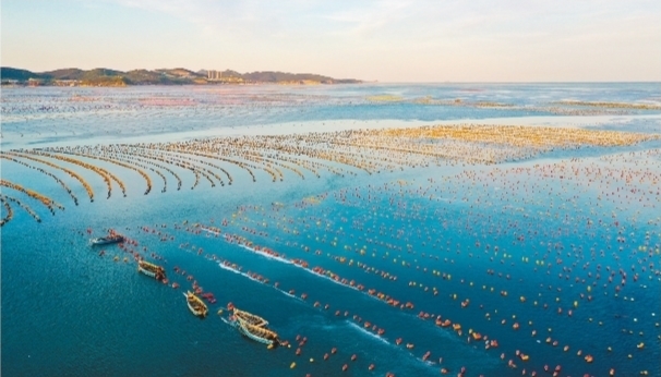 日前,大連市旅順口區海域的海帶進入成熟期,養殖戶開始搶收,海面上一派繁忙景象。5月18日,記者看到,在寬闊的海面上,一顆顆彩色浮球整齊排列,通過繩索連接成浮筏,勾勒出整齊的“田壟”,一排排海帶隨波搖曳。