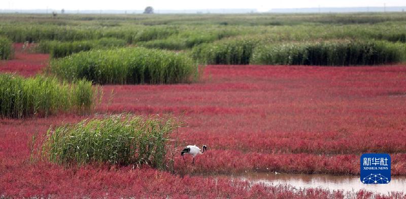 這是在遼寧紅海灘國家濕地公園里拍攝的丹頂鶴。(2021年8月19日)。新華社記者 姚劍鋒 攝
