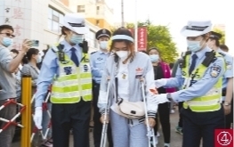 在阜新市實驗中學考點門前,民警攙扶著受傷的考生進入考場。