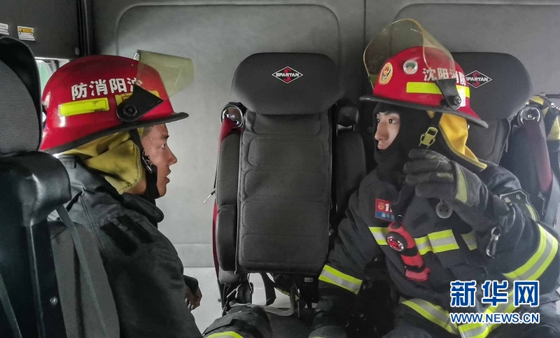 ?李慶禹(右)在消防車上穿戴好滅火服準備前往現場。新華網 夏銘陽 攝