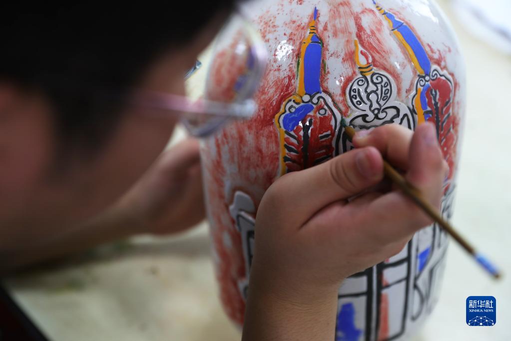 6月16日,在撫順大官窯陶瓷工作室,一位學生體驗陶瓷繪畫。新華社記者 楊青 攝