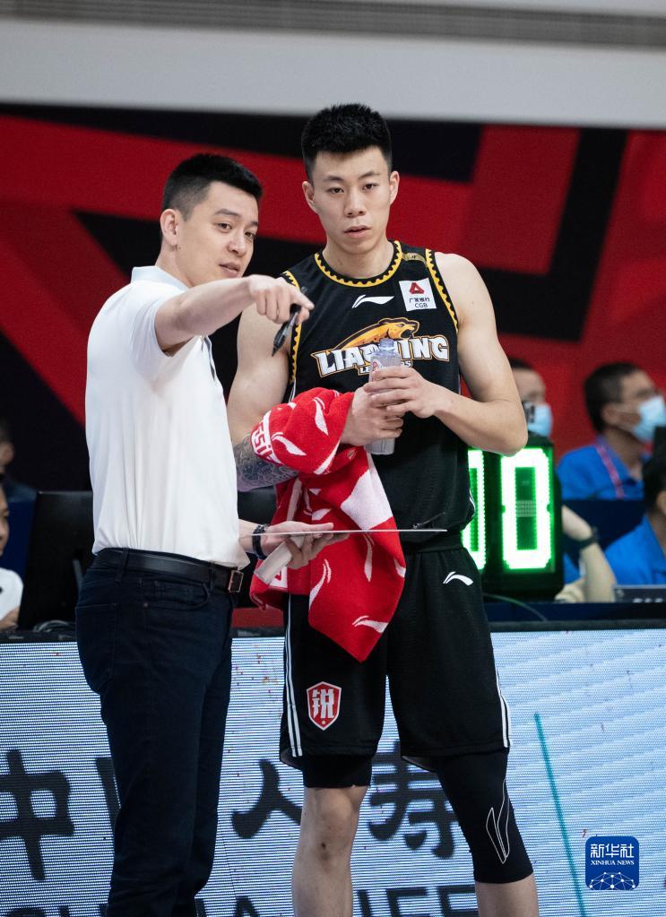 2021年10月17日,遼寧隊球員張鎮麟(右)與主教練楊鳴在場邊交流。新華社記者王冠森攝