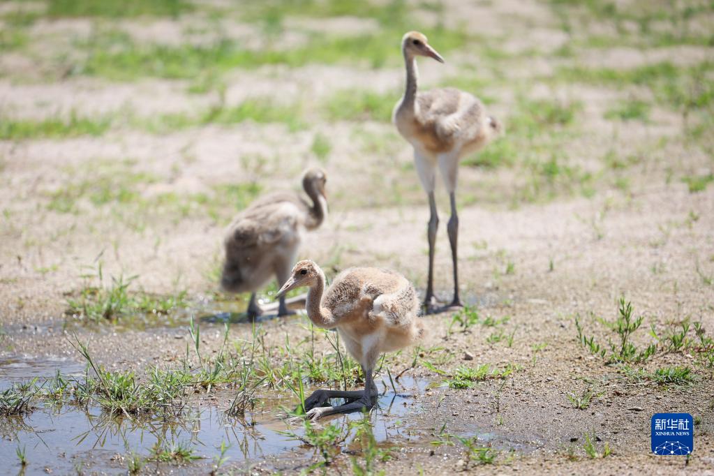 7月14日,幾只丹頂鶴雛鳥在保護站內休息。新華社記者 潘昱龍 攝