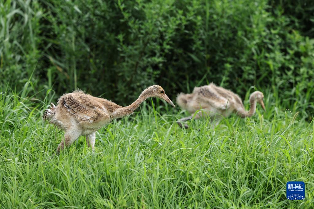 7月13日,丹頂鶴雛鳥在保護站內活動。新華社記者 潘昱龍 攝