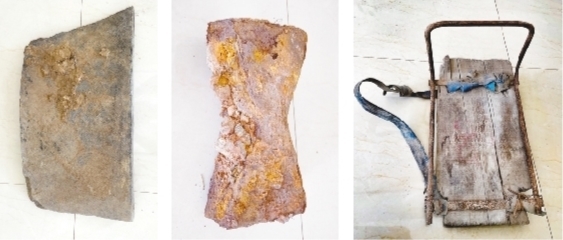 從左至右:板瓦、榫鐵、背磚工具。(受訪者供圖)