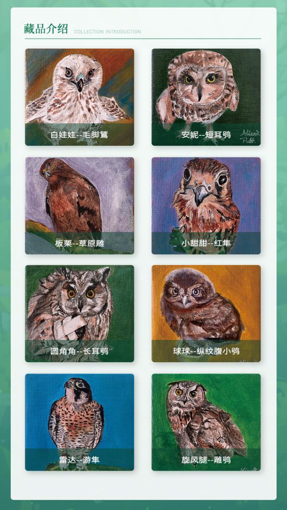 “天空守護者·猛禽救護隊”數字公益藏品共有8個猛禽IP角色,他們都取材自護鳥志愿者救助、放飛過的鳥。這些或氣勢威猛,或嬌媚可愛的飛鳥,激發了志愿者們的想象力,利用數字技術將它們還原,并賦予了新的角色形象。