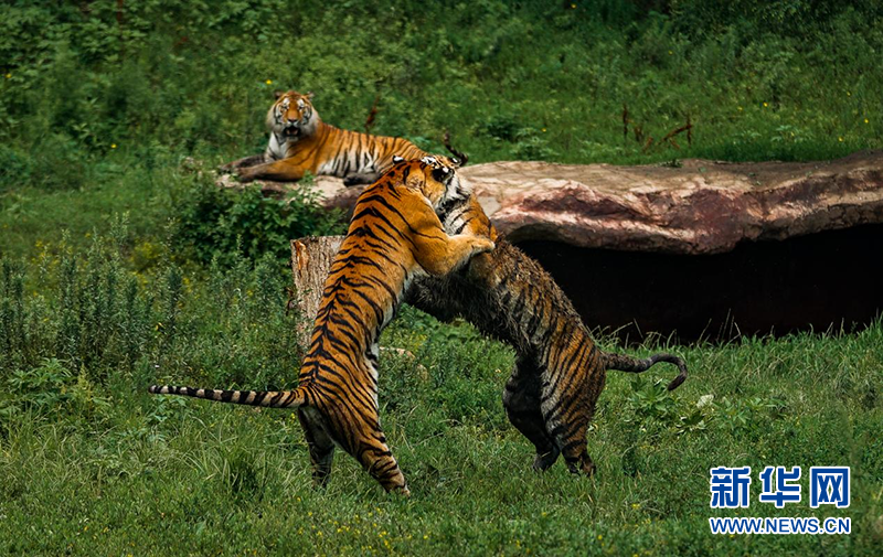 圖為東北虎在草地上嬉戲打鬧。新華網發