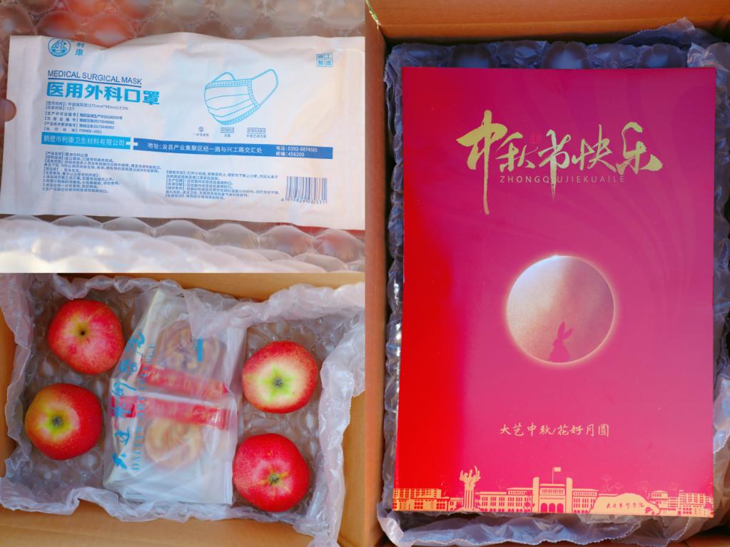 據介紹,學校為學生定制的中秋月餅分為五仁和川酥百果兩種口味,月餅正面印有大連藝術學院LOGO。除了定制的月餅外,暖心禮包還包含了“平安果”、防疫口罩和節日賀卡。此外,部分學生還收到了新學期的教材。