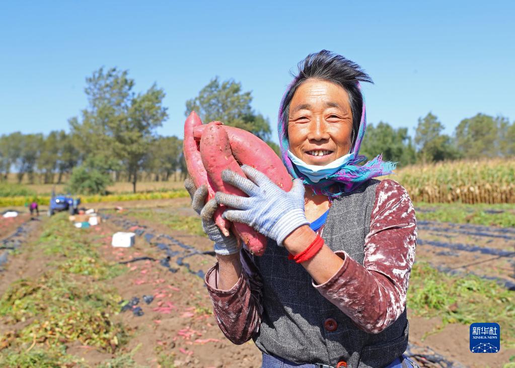 9月21日,在康平縣方家屯鎮十家子村,農民展示收獲的紅薯。新華社記者 楊青 攝