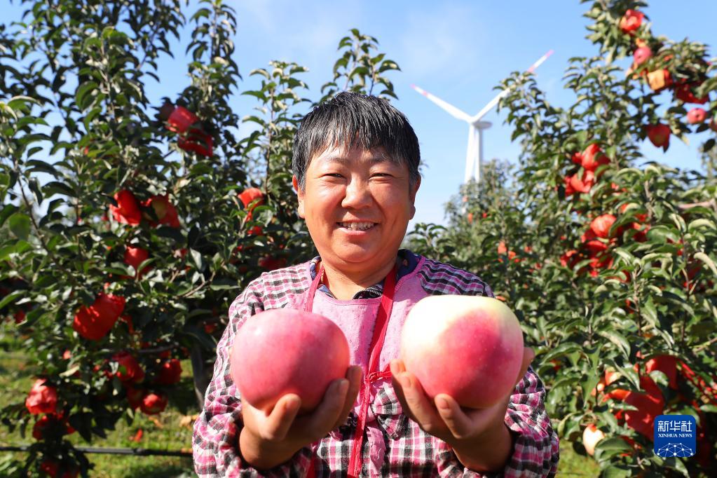 沈陽市康平縣方家屯鎮,康平紅薯、蘋果、小米等特色地標農產品豐收在望,農民在田間果園采摘勞作。