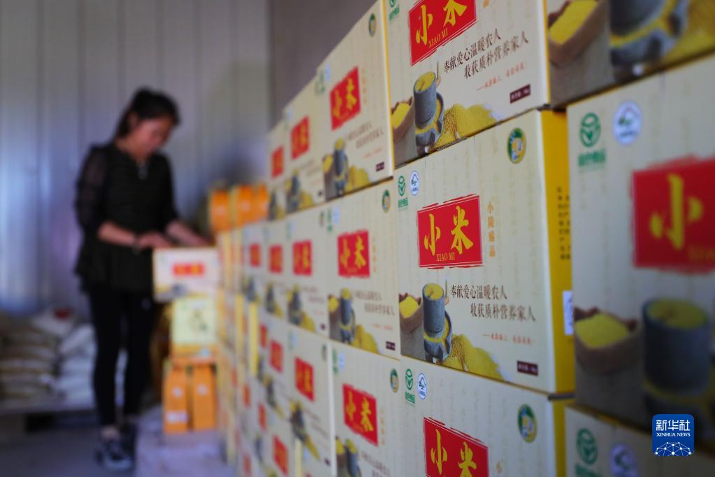 9月21日,在康平縣方家屯鎮東小陵村,農民將封裝好的小米裝箱。新華社記者 楊青 攝