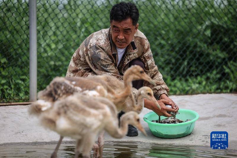 在位于中國遼河入??诟浇倪|寧鶴類種源繁育基地,7000余畝蘆葦蕩綠浪翻涌。烈日下,50歲的趙仕偉撥開伸到路邊的葦葉,沿著褐色的木棧道,察看高大鶴舍里出生不久的小丹頂鶴長勢。