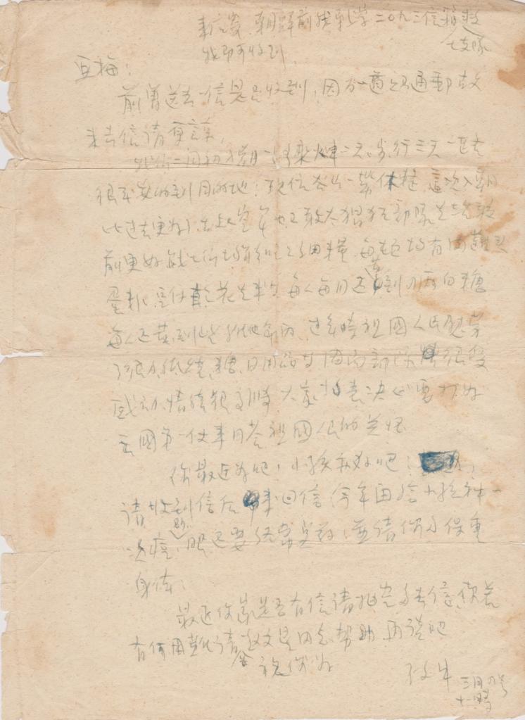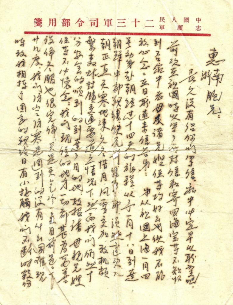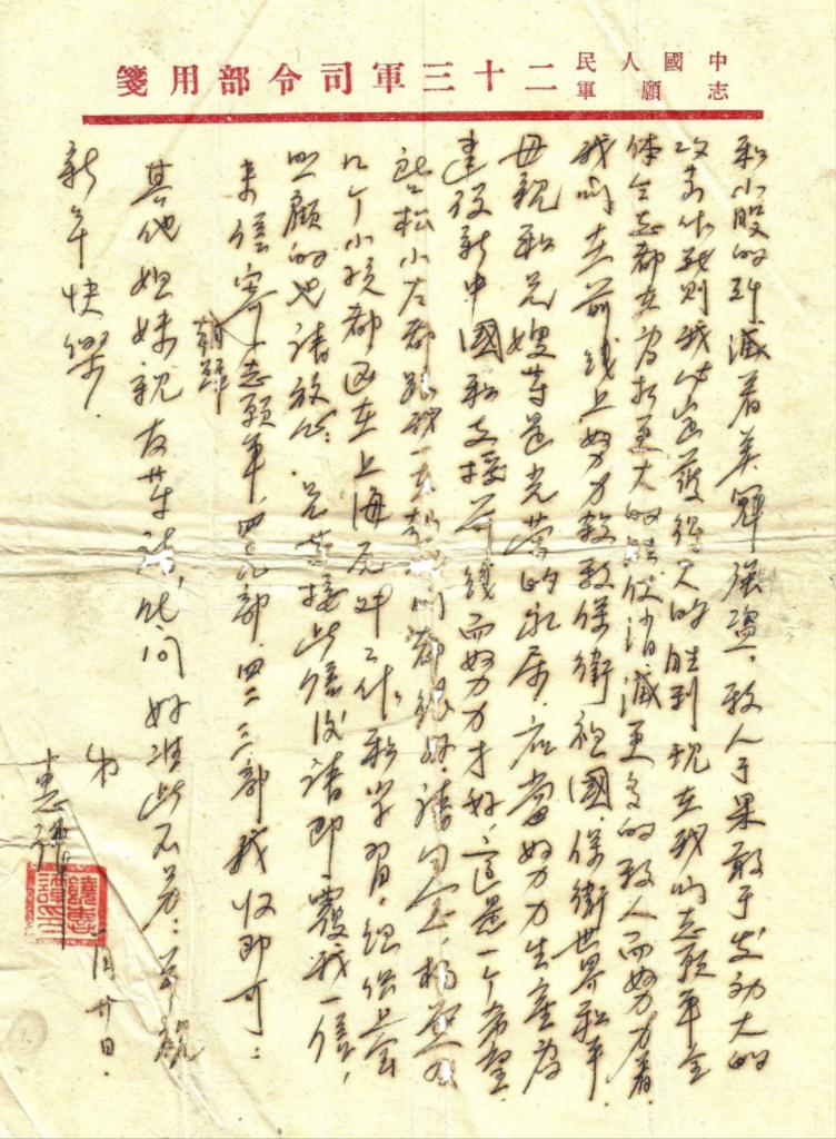 “現時敵我相持于固定的戰線,日有小接觸,我們不斷殺傷和小股殲滅著美寇強盜。敵人于(如)果敢于發動大的攻擊作戰,則我必定獲得大的勝利?,F在我們志愿軍全體同志都在為打更大的勝仗,消滅更多的敵人而努力著。我們在前線上努力殺敵保衛祖國,保衛世界和平。母親和兄嫂等是光榮的家屬,應當努力生產為建設新中國和支援前線而努力才好,這是一個希望?!?/p>