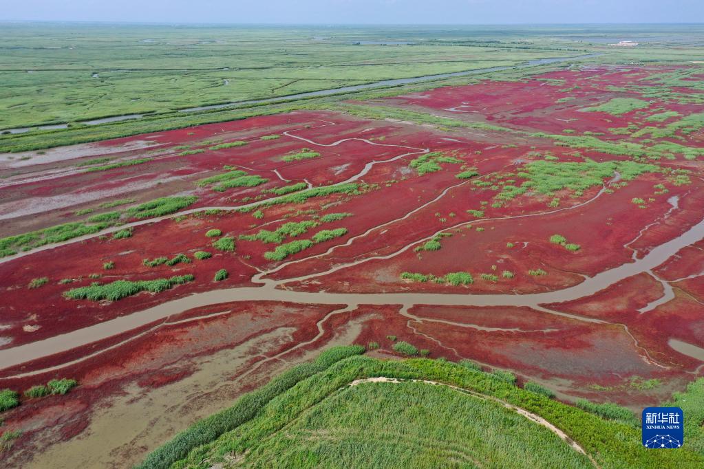 這是遼河入??谂蕴赜械募t海灘(2021年8月19日攝,無人機照片)。新華社記者 姚劍鋒 攝