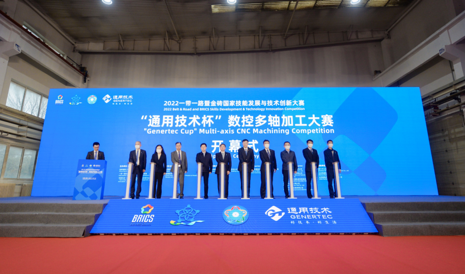 開幕式上,現場嘉賓共同觸摸啟動屏,宣布2022“一帶一路”暨金磚國家技能發展與技術創新大賽之“通用技術杯”數控多軸加工大賽開幕。(通用技術沈陽機床供圖)