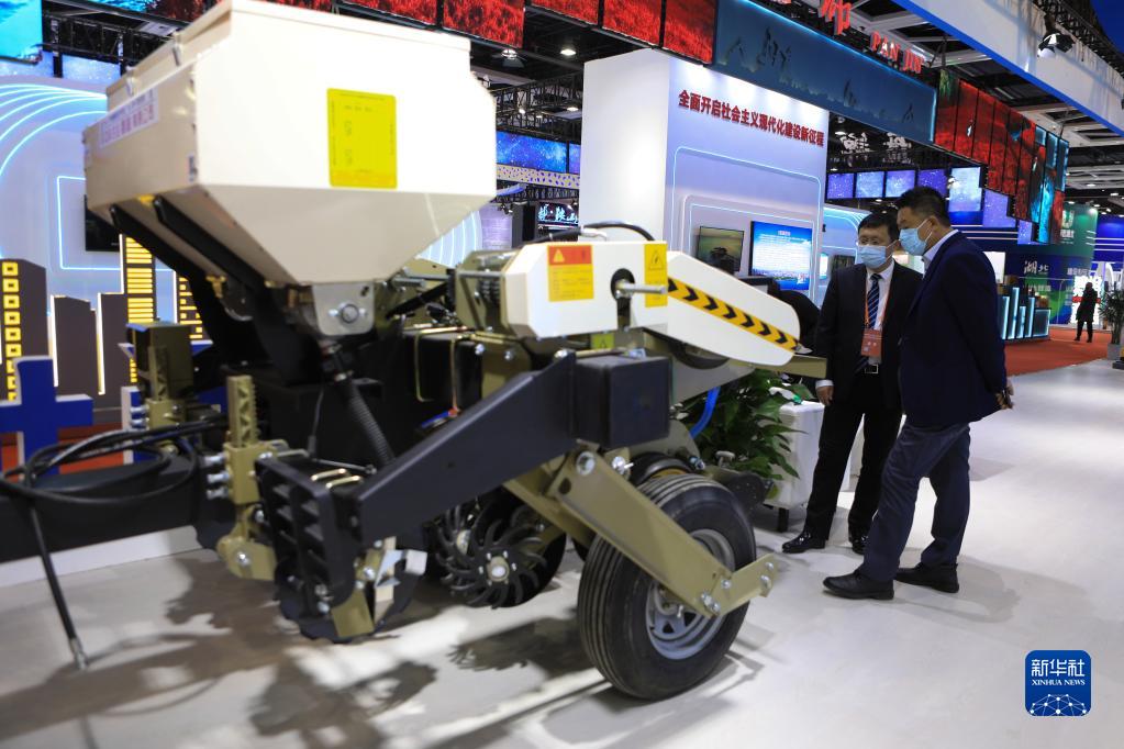 11月18日,人們在洽談會期間舉行的“綠色智造產業產品展”上參觀展出的農機。新華社記者 王乙杰 攝