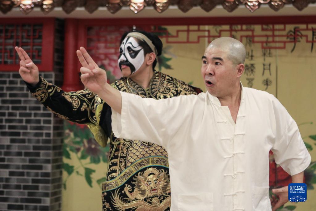 11月14日,沈陽京劇院老師劉大強(右)指導李文龍學習京劇《霸王別姬》。新華社記者 王乙杰 攝