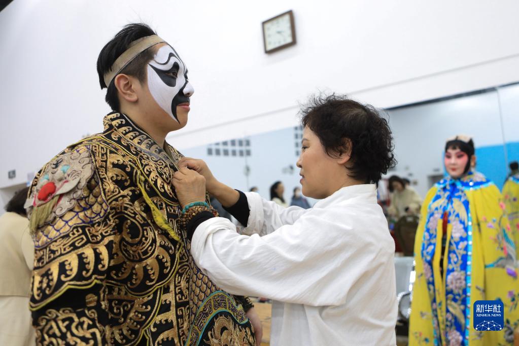 11月14日,沈陽京劇院老師為李文龍(左)穿戲服。新華社記者 王乙杰 攝