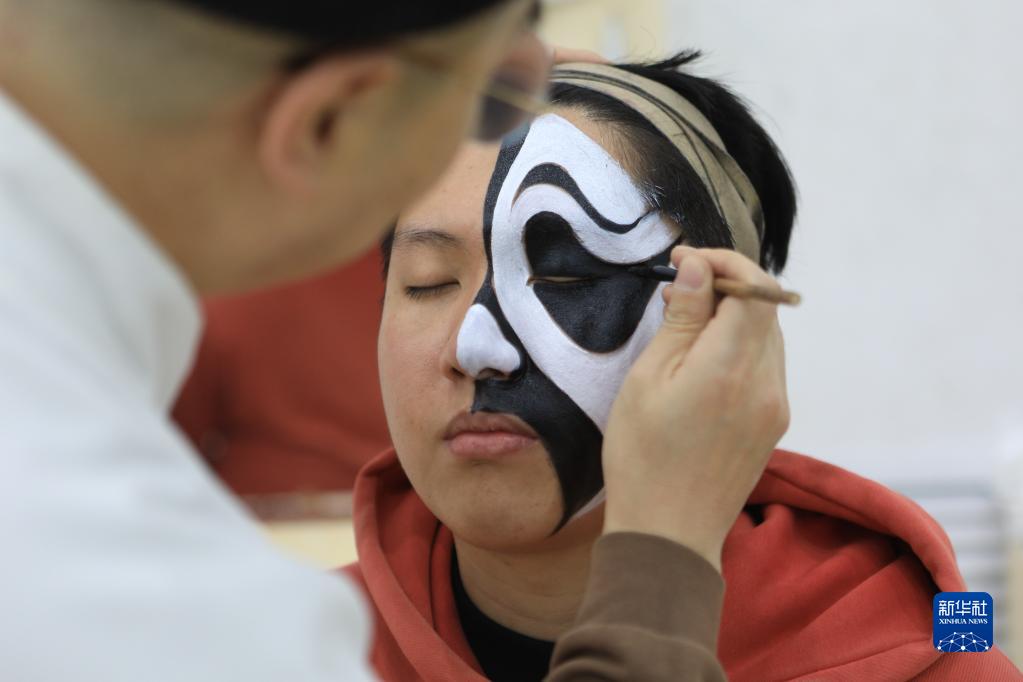 11月14日,沈陽京劇院老師為李文龍(右)化裝。新華社記者 王乙杰 攝