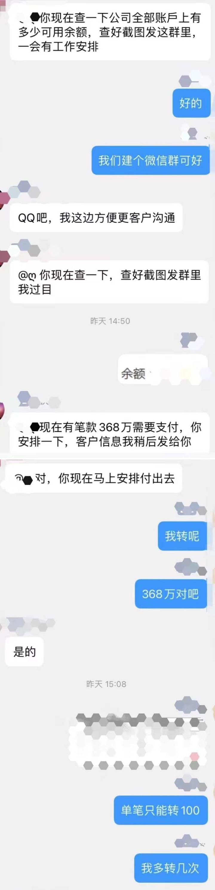 18日15時許,新民市公安局指揮中心接到陳女士報警并了解到:陳女士是公司會計,事發時有人在QQ上冒充其老板趙某某,要求其支付工程款項。隨后,陳女士通過公司賬戶,分4次向對方提供的賬戶轉賬共計368萬元。
