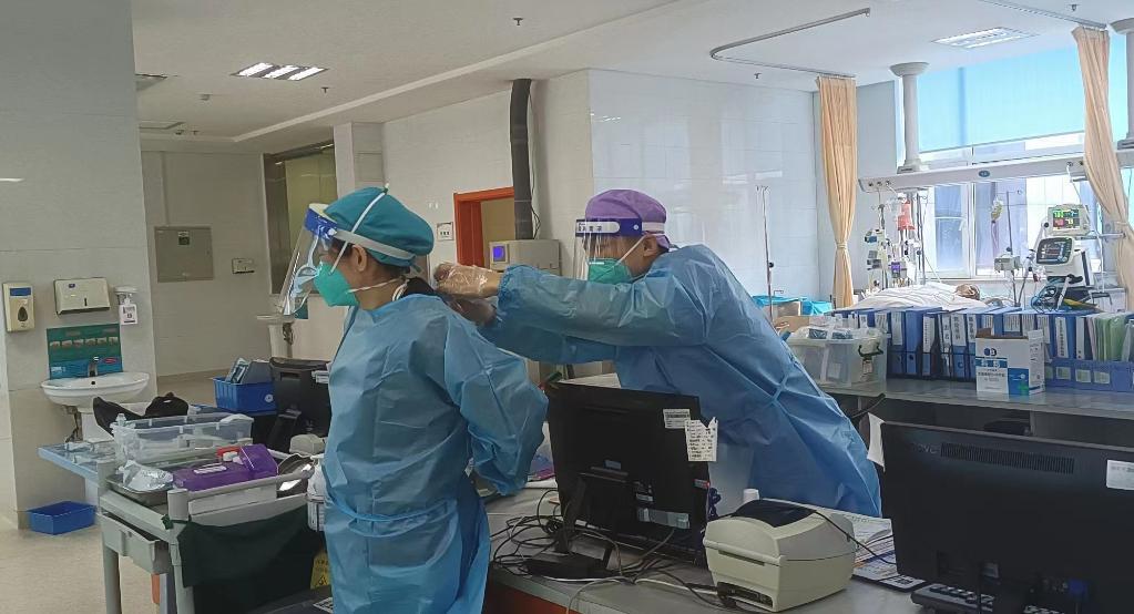 圖為沈陽市第一人民醫院重癥監護室護士路巖(右)幫助同事整理防護服,為即將進入護理崗位做準備。受訪者供圖