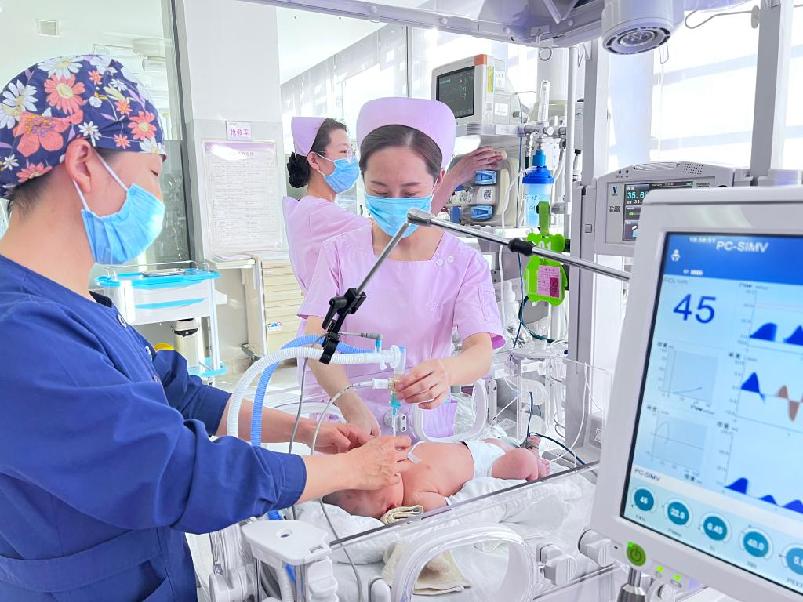 圖為沈陽市兒童醫院新生兒重癥監護病房主任于慕剛(左)在為危重新生兒進行氣管插管呼吸機輔助通氣治療。受訪者供圖