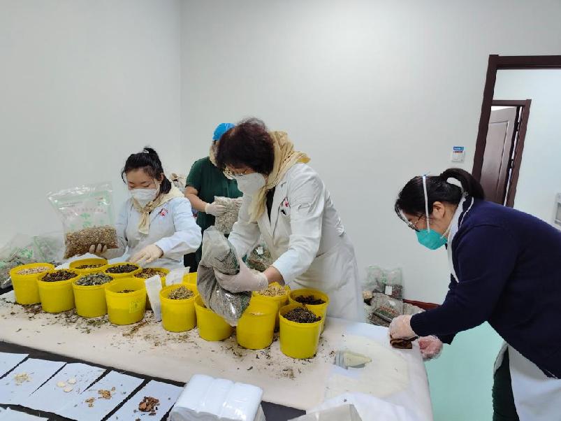 圖為沈陽市第四人民醫院治未病中心主任袁人婕(右)正帶領團隊制作抗疫封包。受訪者供圖