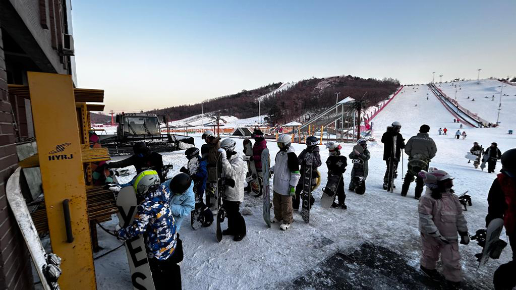 元旦假期,游客在沈陽怪坡國際滑雪場排隊清理雪板。(沈陽怪坡國際滑雪場供圖)