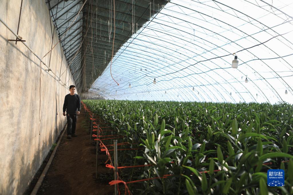 1月5日,在遼寧省凌源市小城子鎮楊大營子村,花農胡永全在大棚內檢查百合長勢。新華社記者 王乙杰 攝