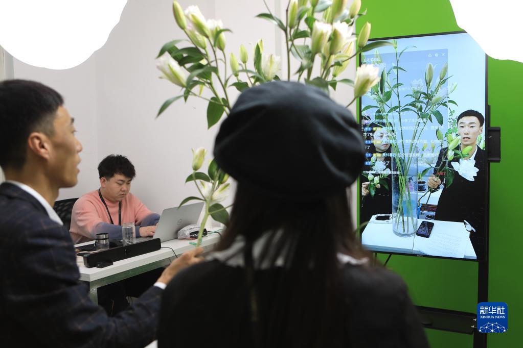 1月5日,在凌源市一家文化傳媒公司,工作人員用網絡直播的方式推介凌源百合。新華社記者 王乙杰 攝