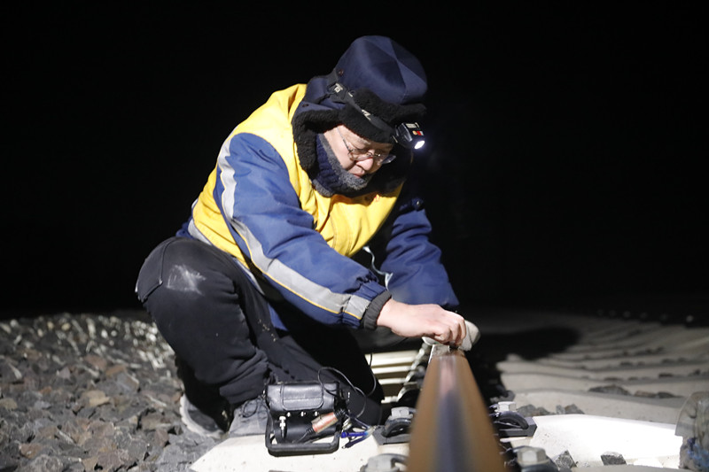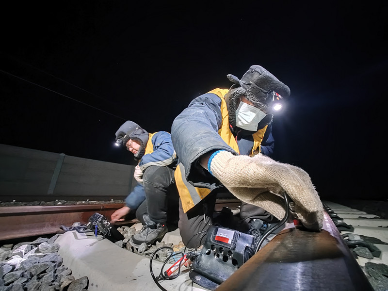 崔?。ㄗ螅┡c工友對新通客專進行鋼軌探傷作業。中國鐵路沈陽局集團有限公司阜新工務段供圖