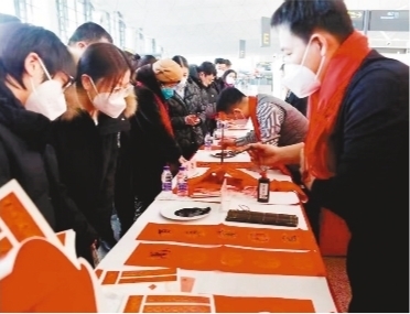 兩個多小時里,書法家們為過往旅客和桃仙機場職工創作和贈送了500副春聯。濃濃的“年味”在航站樓里蔓延開來,一句句暖心的祝福、一副副火紅的春聯,寄托著辭舊迎新、接福納祥的美好祝福。