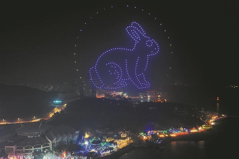 正月初一19時許,300多架無人機表演在老虎灘海洋公園精彩上演,為游客獻上一場視覺盛宴。記者 姚壯 攝