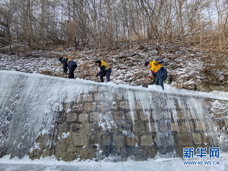 丹東工務段丹東橋隧工清除隧道外側排水溝內的積冰。新華網發 遲金海攝
