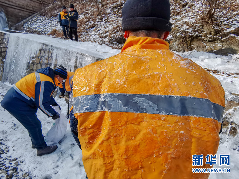 深冬的遼東山區室外溫度接近零下20攝氏度,橋隧工們一邊使用電鎬破冰,一邊用鐵鍬將碎冰塊清除到線路兩邊,冰渣混著山水在作業人員身上凍結,讓橋隧工們穿上了“冰甲”。
