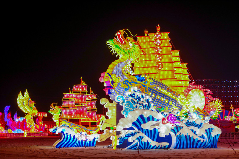 在燈會主會場,單體高30米的彩燈《盛世中華》,由象征吉祥的紅色大鼓、花團錦簇的花籃、紅綢、麥穗等元素構成,吸引游客駐足打卡;彩燈《逐浪新征程》采用龍船造型,打造了一個可360度觀看的全景彩燈,三艘龍船并駕齊驅,迎著朝陽乘風破浪、揚帆起航。