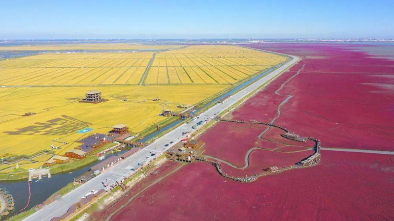 堿蓬草、蘆葦蕩、丹頂鶴、黑嘴鷗構成了人與自然和諧靈動的畫面,2021年盤錦市被生態環境部命名為國家生態文明建設示范區,2022年成功入選國際濕地城市。