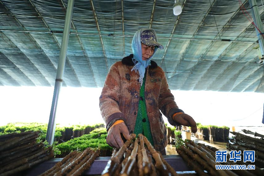 在新民市大民屯鎮毓寶臺村大棚里,農民在分揀刺嫩芽。新華社記者 楊青 攝