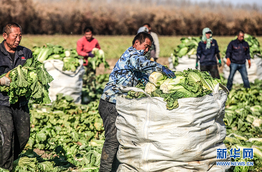 圖為收獲季,在新民市大民屯鎮內,在田間收割大白菜的村民。新華網 夏銘陽 攝