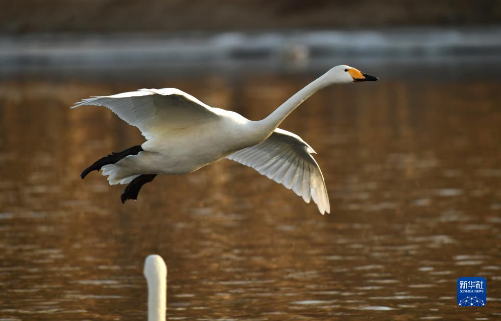2月21日,在北票市八家子鄉紅村大凌河畔,天鵝在水面上飛翔。新華社記者 楊青 攝