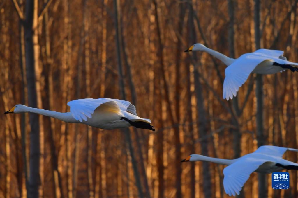2月21日,在北票市八家子鄉紅村大凌河畔,天鵝在空中飛翔。新華社記者 楊青 攝