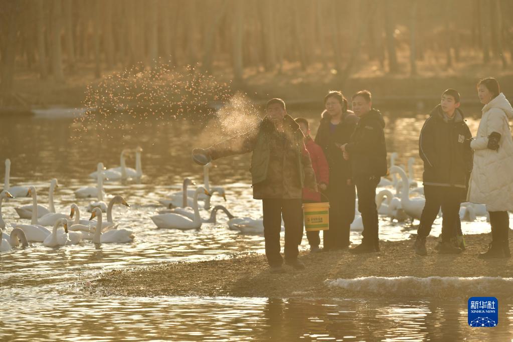 2月21日,在北票市八家子鄉紅村大凌河畔,志愿者李海峰在給天鵝喂食。新華社記者 楊青 攝
