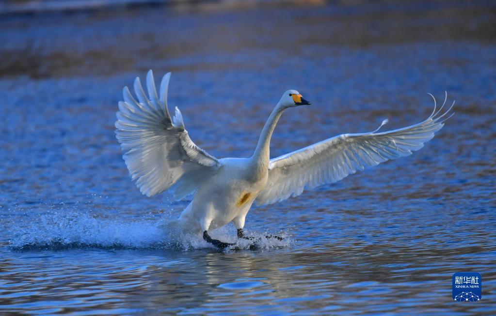 2月21日,在北票市八家子鄉紅村大凌河畔,天鵝在水面降落。新華社記者 楊青 攝