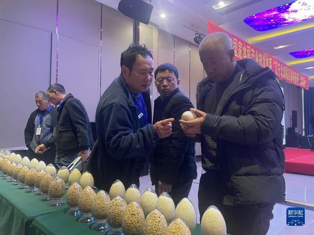 選種臺前,李玉新(右三)正在向稻農介紹鐵粳11號。新華社記者武江民 攝