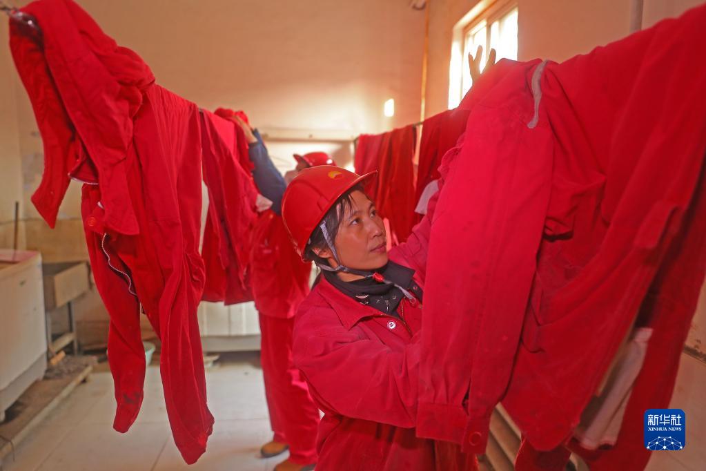 2月27日,在焊接車間洗衣房,王喜蓮在晾曬工服。新華社記者 楊青 攝