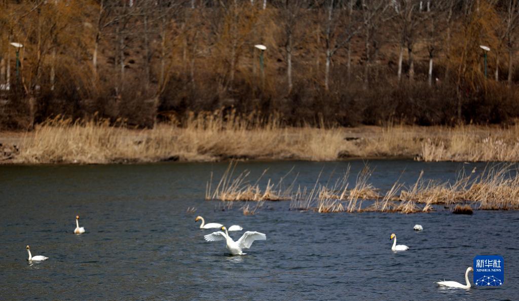 3月10日,天鵝在錦州市女兒河水面上棲息覓食。新華社記者 姚劍鋒 攝