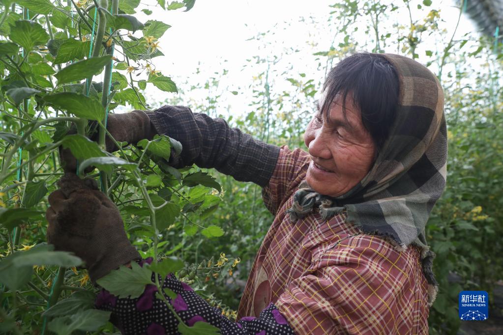 3月14日,村民在岫巖縣洋河鎮的圣女果大棚中固定圣女果的枝蔓。新華社記者 龍雷 攝