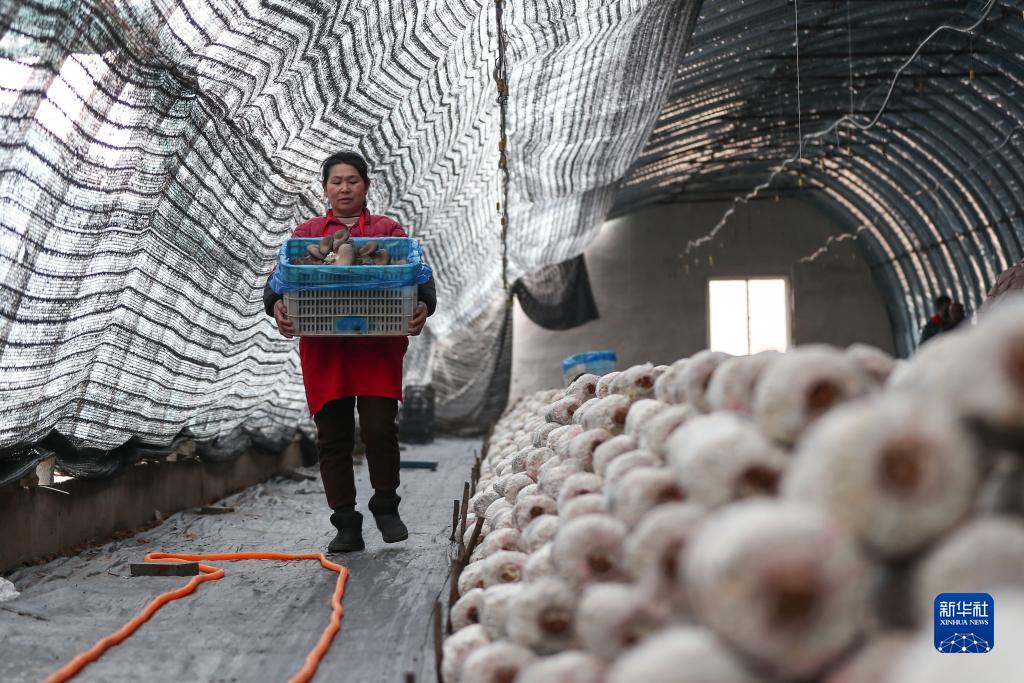 3月14日,村民在岫巖縣三家子鎮的平菇大棚搬運蘑菇。新華社記者 龍雷 攝