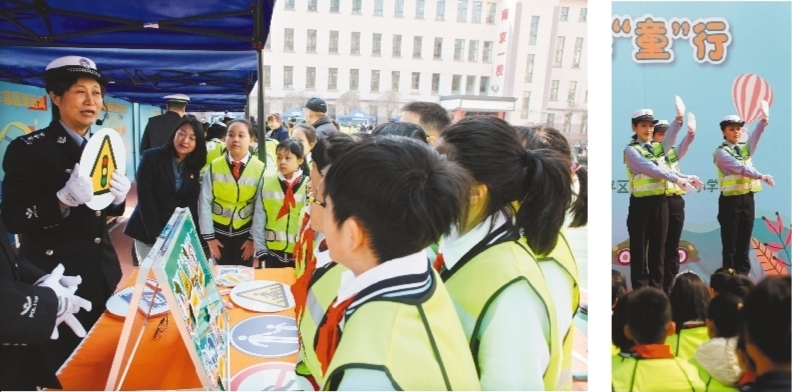 活動現場,左圖為同學們在學習交通安全知識,右圖為女交警們表演《律動平安》手勢操。記者 趙敬東 攝