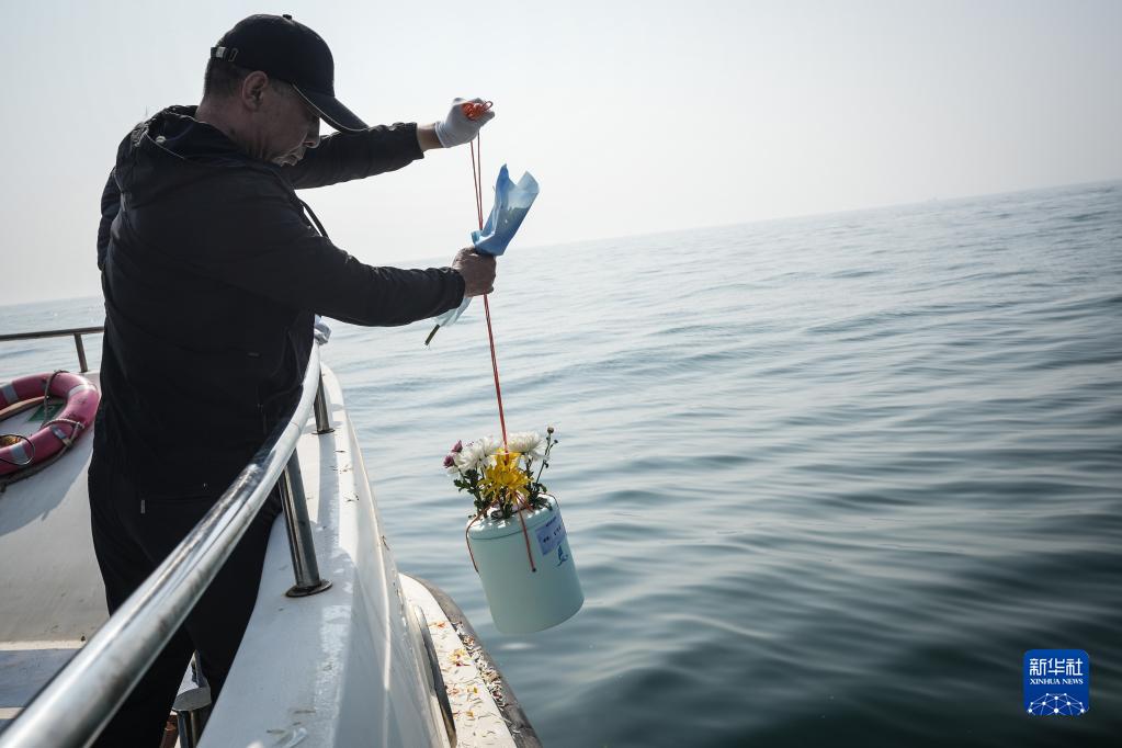 10多分鐘后,輪船抵達指定海域,清風徐徐、海浪翻滾,逝者家屬手捧骨灰罐和鮮花依次走向甲板。在與親人的聲聲道別中,家屬們提著繩子,將骨灰罐緩緩放入大海,罐體在花瓣的簇擁下漂向遠方并慢慢下沉。與傳統祭祀不同,海葬沒有火燭和紙錢,只有鮮花相伴、海風送拂,逝者在大海的懷抱中得以永生。